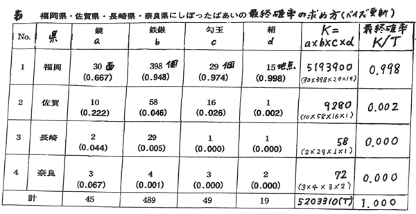 ■ベイズの定理の証明 第418回2025年3月31日邪馬台国の会の講演のさいに配布した資料から、下図の表(福岡県・佐賀県・長崎県・奈良県にしぼったばあいの最終確率の求め方)がある