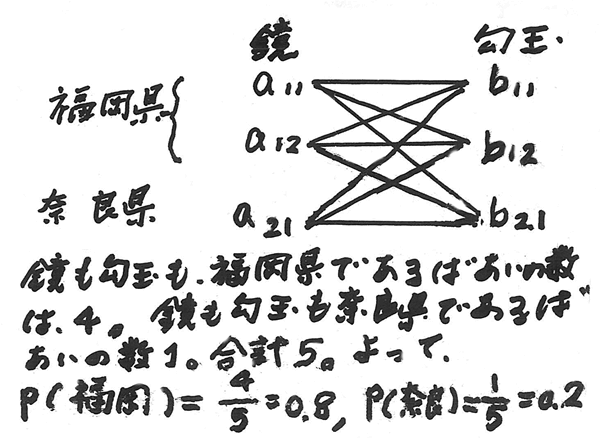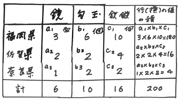 以上のように見てくると、(A)の、行(横)の数値を掛け合わせた数値は、「鏡」「勾玉」「鉄鏃」の3つがともに出てくる場合の数を数えるものであり、「鏡」と「勾玉」と「鉄鏃」がともに出土するという条件のもと(条件付き確率)で、「福岡県」なら「福岡県」が占める空間(面積)の大きさを示していることになる。