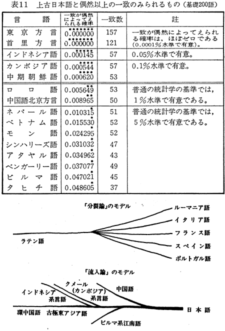 シフト法によって、さまざまな言語のうち「上古日本語」と偶然以上の一致が見られる言語は右表のとうり。 「上古日本語」は東京方言や首里方言と多くの一致を示すが、日本列島を離れると一致数は激減する。 おもしろいことに、「上古日本語」と「カンボジア語」や、「上古日本語」と「中期朝鮮語」は、偶然以上の一致を示すが、「カンボジア語」と「中期朝鮮語」だけを取り上げてみると、この間には偶然以上の一致は認められない。 これは、右図に示すように、日本語がヨーロッパの言語のように祖語から分裂してきたものではなく、さまざまな言語が流れ込んでできあがった言語であるためと考えられる。 ■ 日本語形成のプロセス 古極東アジア語からわかれた古日本語(日本基語)は、はじめ、北九州と南部朝鮮にあり、ビルマ系江南語と結びついて、倭人語(日本祖語)が成立した。 その言語を母胎として、大和朝廷の原勢力邪馬台国が北九州に発生し、大和朝廷の原勢力が南九州におよぶとともに、台湾原住民の言語アタヤル語などと関係をもつインドネシア系の言語の語彙を吸収した。 さらに、その原勢力が東漸し大和朝廷をたて、その力が日本列島の各地におよぶとともに、縄文期に長年月にわたって庶民の間でかなり広く広がっていたインドネシア系の言語や、クメール(カンボジア)系の言語などをも吸収しながら、日本列島を、言語的に統一していった。 また、朝鮮語は、もともとは、現代よりも北のほうで行われていたのが、南下したと考えられる。