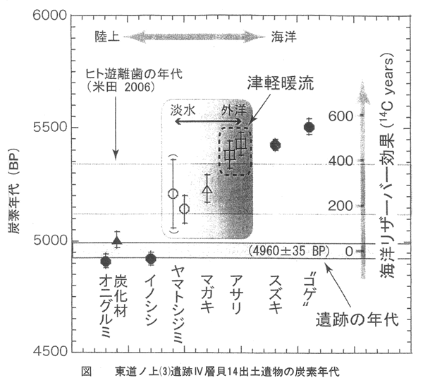 表 をみると、土器付着炭化物は、総体的に、貝よりも古い年代を示している。やはり、海洋リサーバー効果によっては、説明しにくいようにみえる。
