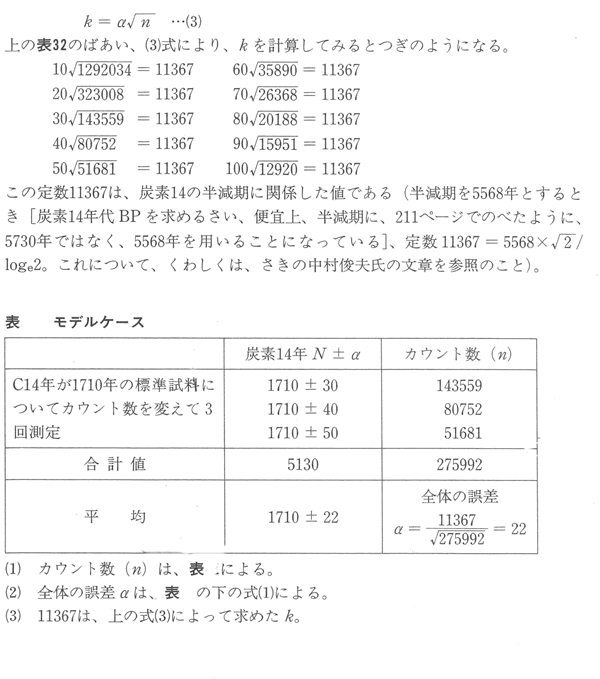 表 の下の[安本註]に記したように誤差の絶対値をα、カウント数をnとすれば、つぎの式がなりたつ。