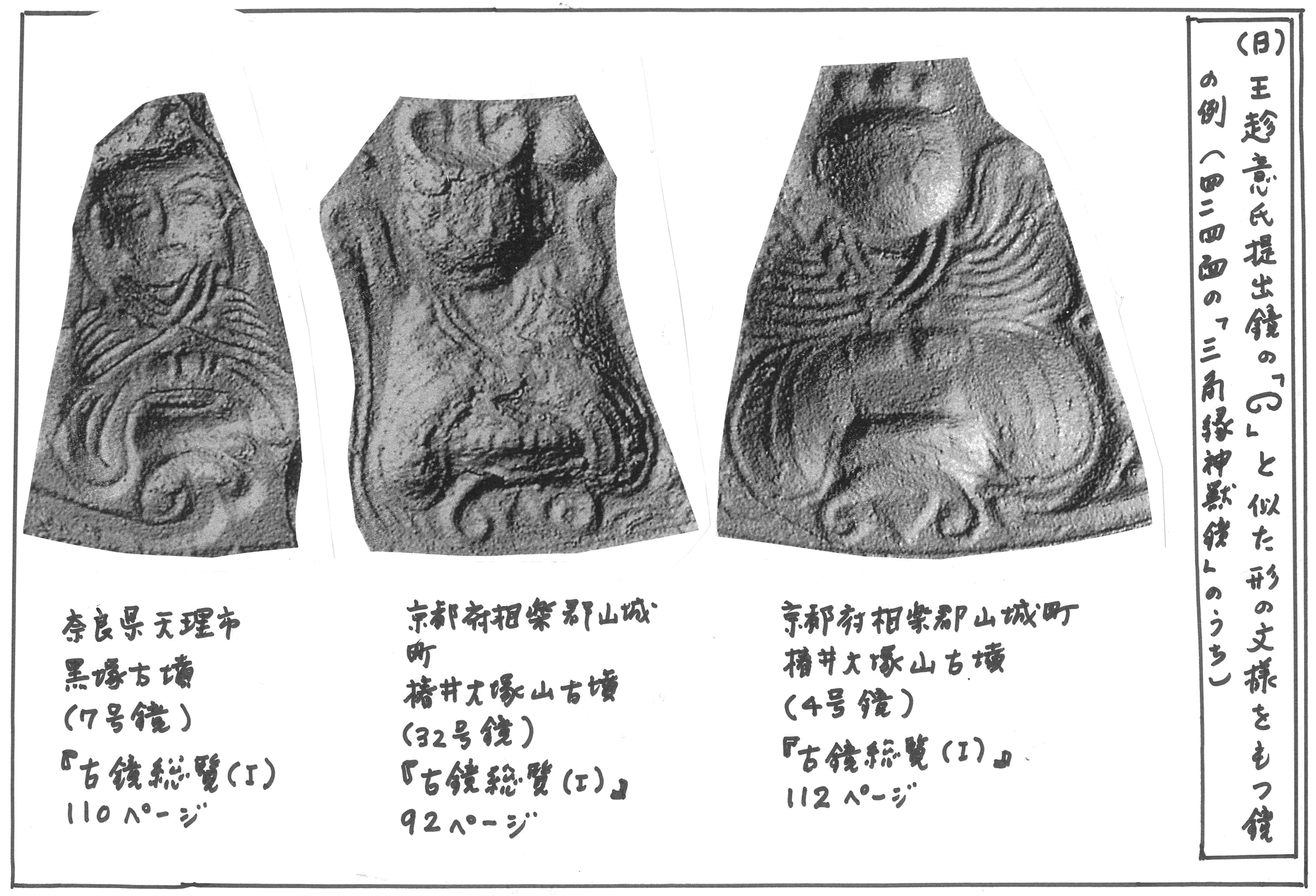 このように王趁意氏提出鏡の銘文31文字のうち、30文字は京都の椿井大塚山(つばいおおつかやま)古墳、出土の2面と、島根県の神原神社古墳出土の合計わずか2古墳出土の3面の鏡の銘文を見本に組み合わせれば構成できる。これは全中国の出土鏡のいかなる3面をとってもこのようなことはできない。