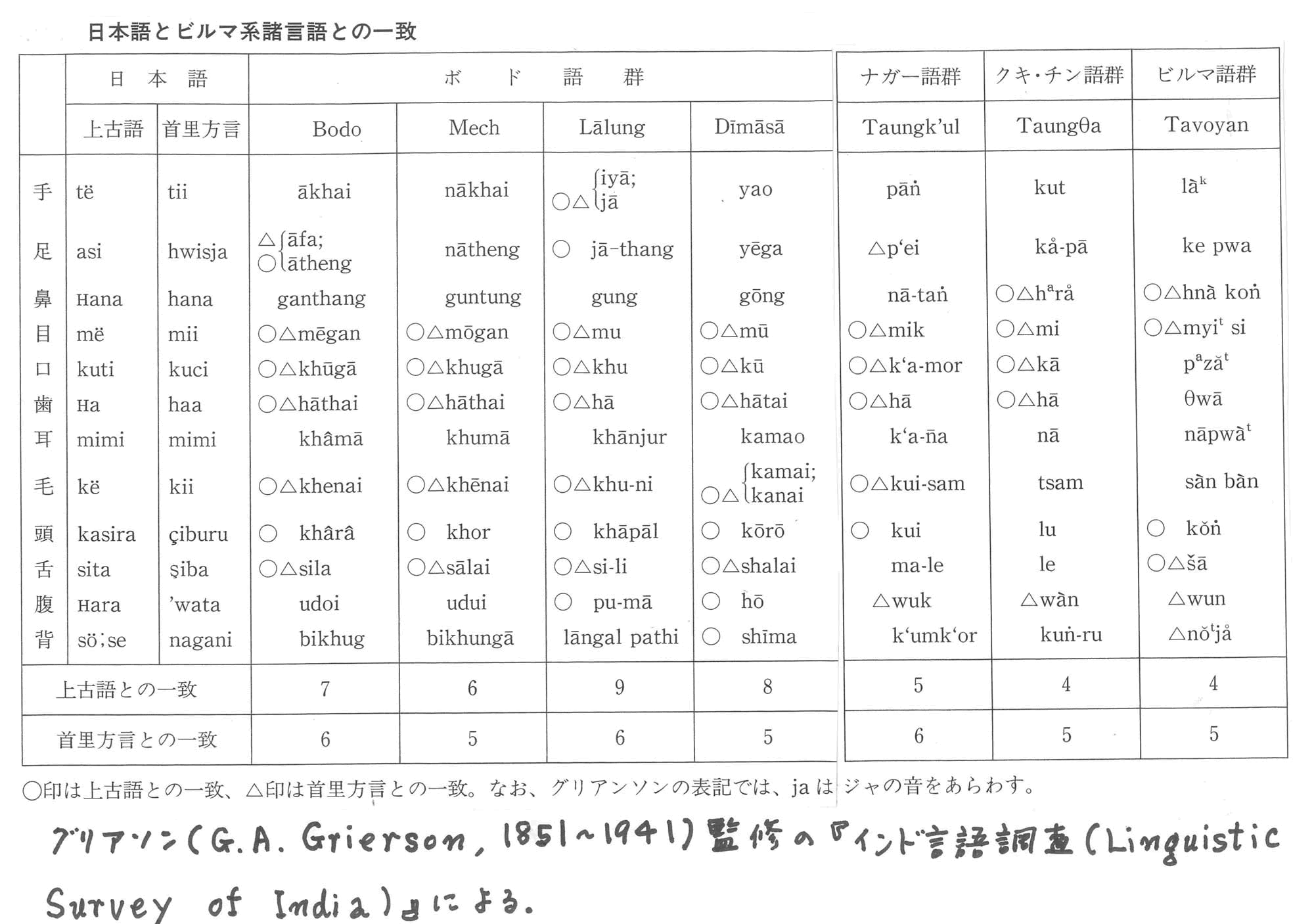 ・英国がインドを植民地にしたころ、英国人のグリアソンがインド近辺の諸民族の言語を調査した。その調査結果が役に立っている。その中でビルマ奥地の諸言語が身体語について日本語に、ひどく近いことが分かった。ビルマ系諸言語(ナガ語、ボド語、ディマーサ語など)が行われている地域は下の地図にあるビルマ(ミャンマー)の奥地である。