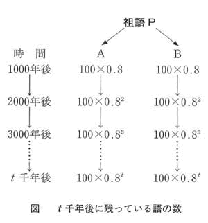一般に、t千年後には、もとの基礎語彙の0.8↑tが残存することになる。