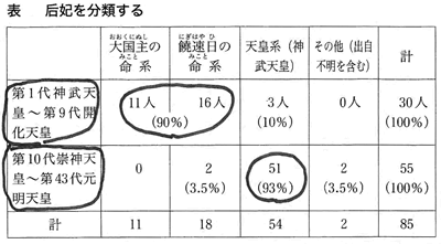 なぜこのようになるかというと、両家相続パターン[女性中継(なかつ)ぎによる支配権の継承、貴種への帰属パターン]が考えられる。