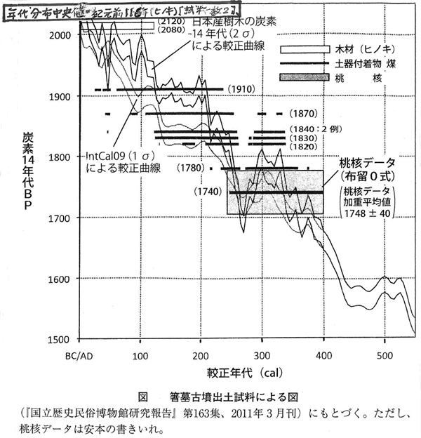 一つ上の図(箸墓古墳出土資料による図)の左上の二つのヒノキのデータをみれば、ヒノキの年代がいかに古くでているかがうかがわれよう。