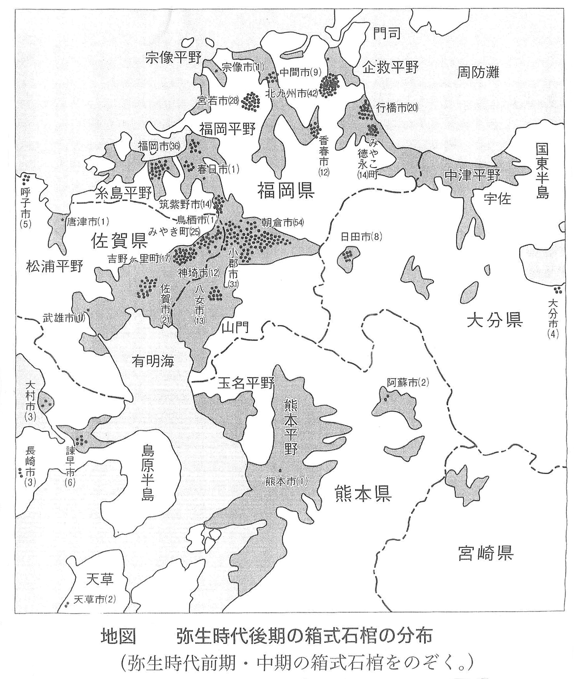 弥生時代後期の箱式石棺は福岡県朝倉市に多く分布する。