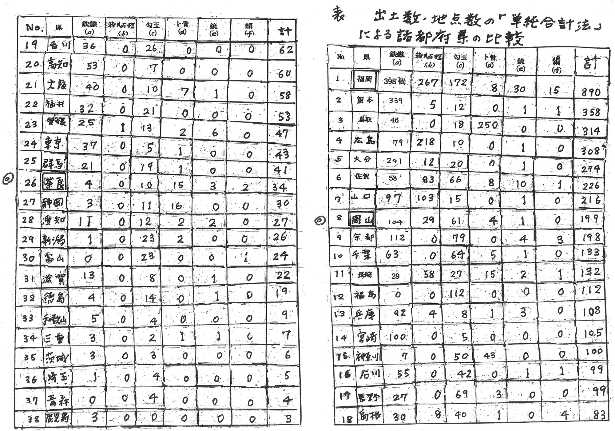 広島大学の川越哲志の編集した『弥生時代鉄器総覧』(広島大学文学部考古学研究室、2000年刊)によるとき、福岡県と奈良県の、弥生時代の「鉄の矛」の出土状況は、下の表のようになっている。