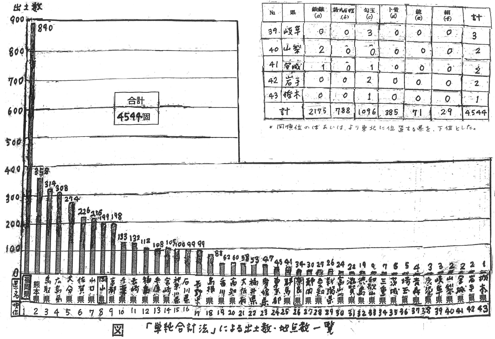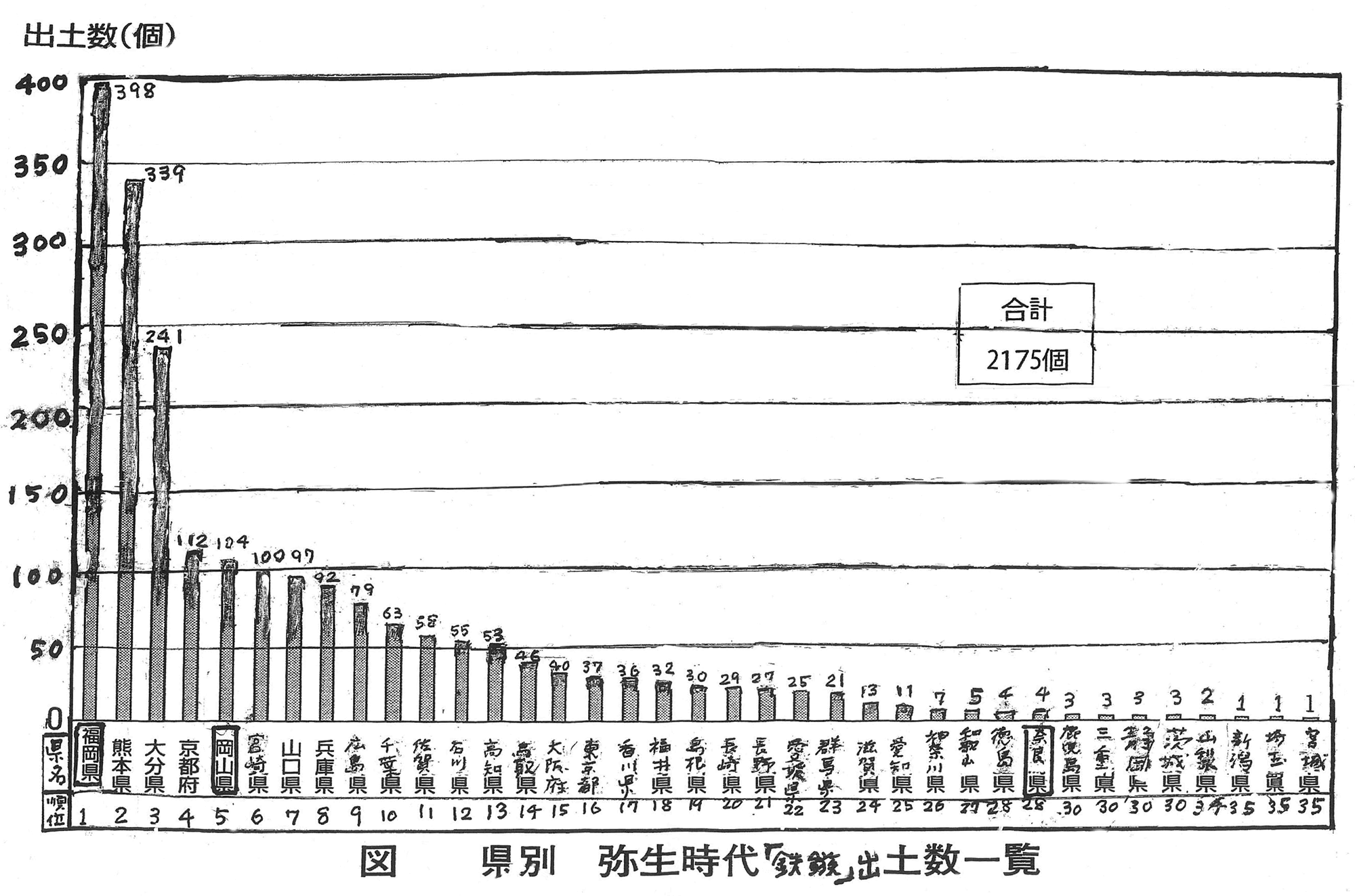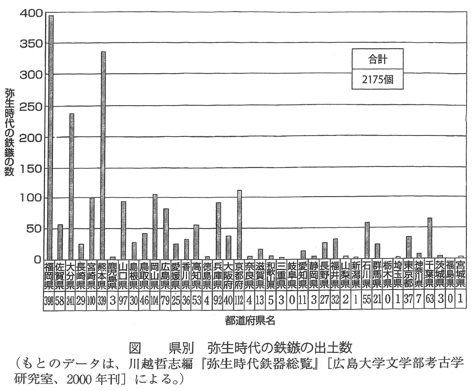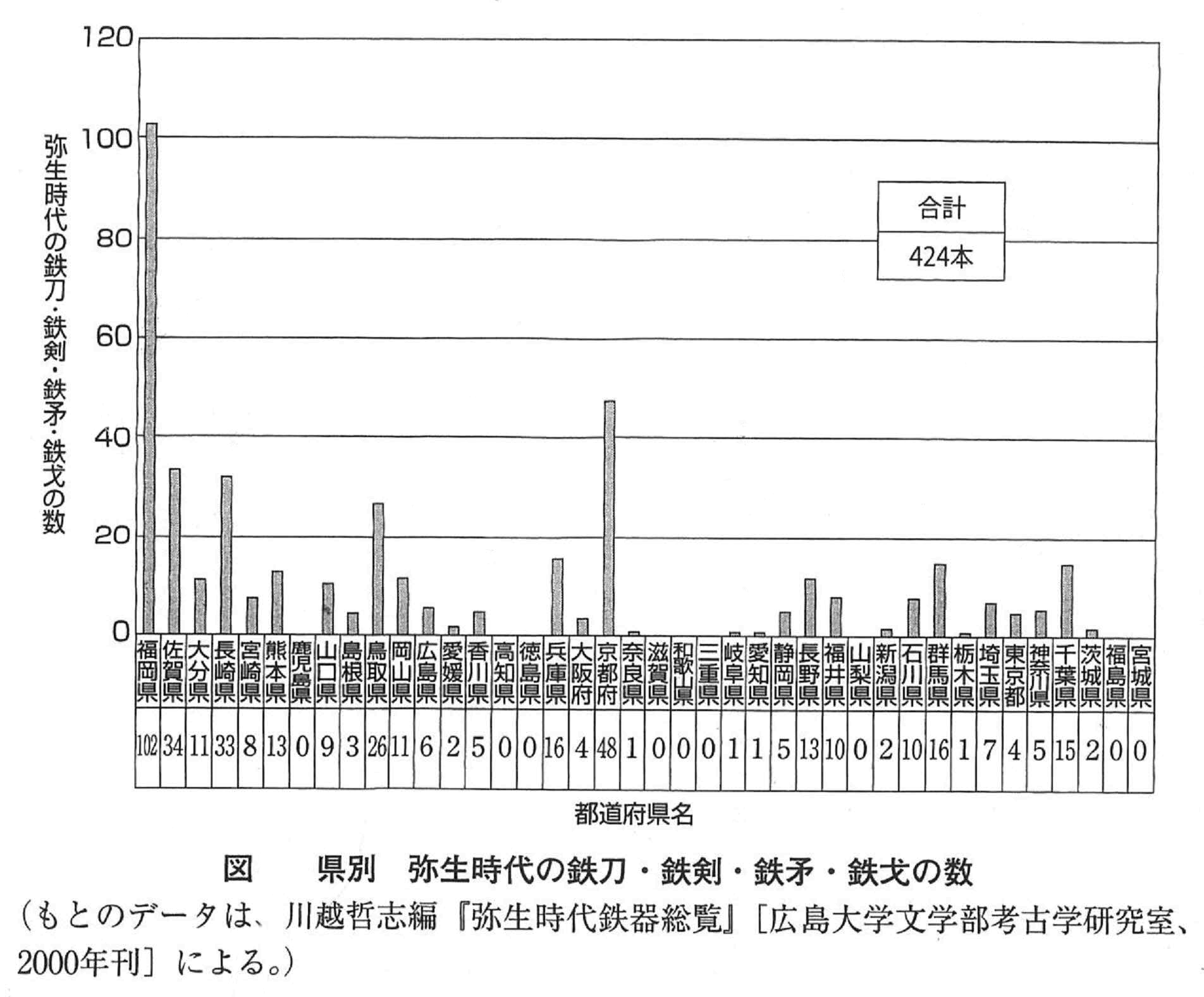 この拙論で示した上の方にある図の「弥生時代の鉄鏃の県別出土数」は、寺沢薫氏が、指示または支持された川越哲志氏の『弥生時代鉄器総覧』によっている。