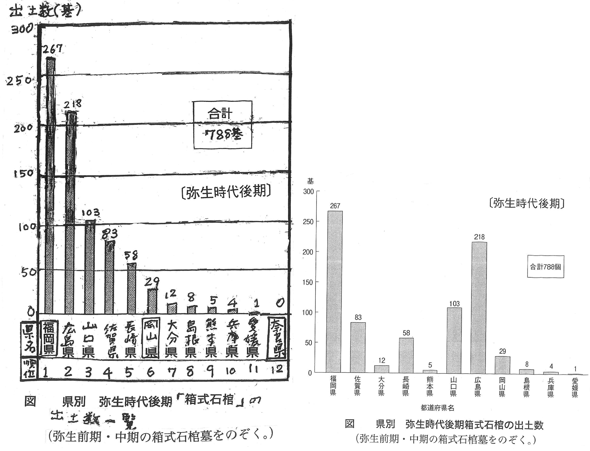 弥生時代後期の箱式石棺の出土数は福岡県が一番多い。岡山県が6位で、奈良県は0である。
